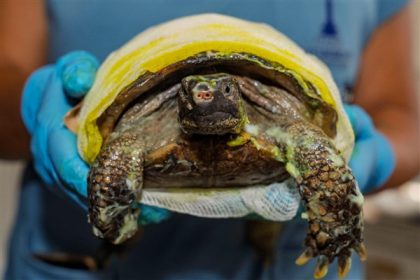 İzmir’de yangından kurtarılan kaplumbağanın tedavisi sürüyor